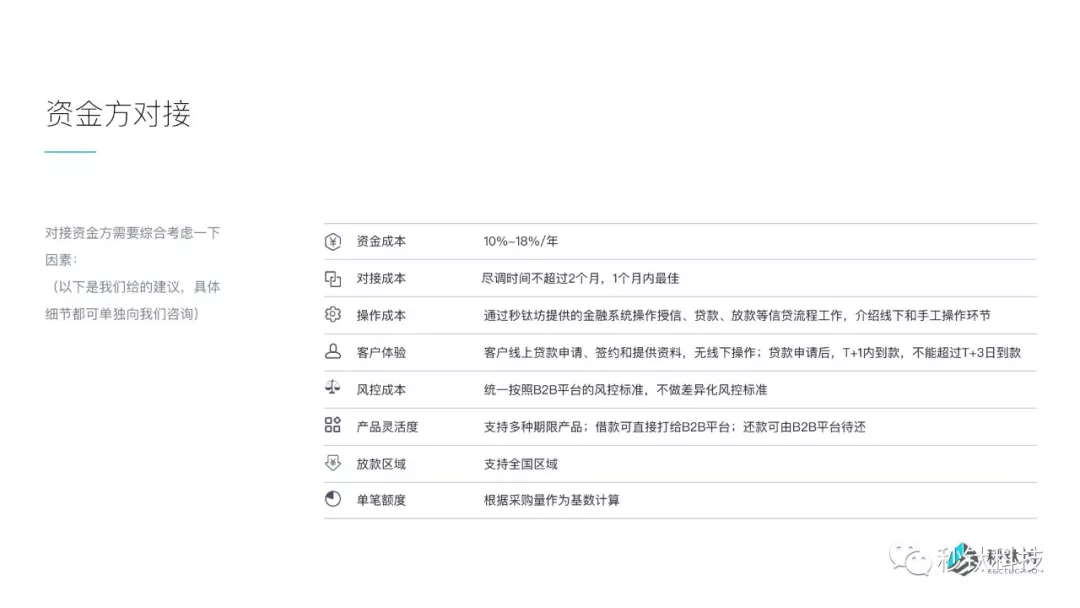 在对接资金方过程当中需要参考以下几个维度,成本范围在10%-18%/年,对接的尽调时间不要超过两个月,一个月以内为最佳。操作方面通过线上金融系统操作尽量减少线下和手工的操作环节,客户线上的贷款申请签约贷款申请之后T+1到款最好不要超过T+3。风控的话,统一按照B2B平台的风控标准不做差异化的风控标准。产品的灵活度,支持多种期限产品。