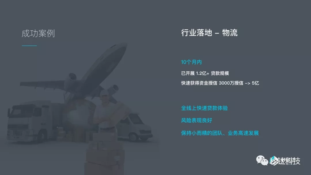 秒钛坊落地的行业,主要是在物流行业,已经上线了将近十个月,规模在1.2个亿左右。授信从3000万增长到5个亿。整个流程都是线上完成的,目前的风险表现也非常好,他们可以保持小而精的团队,业务高速发展。