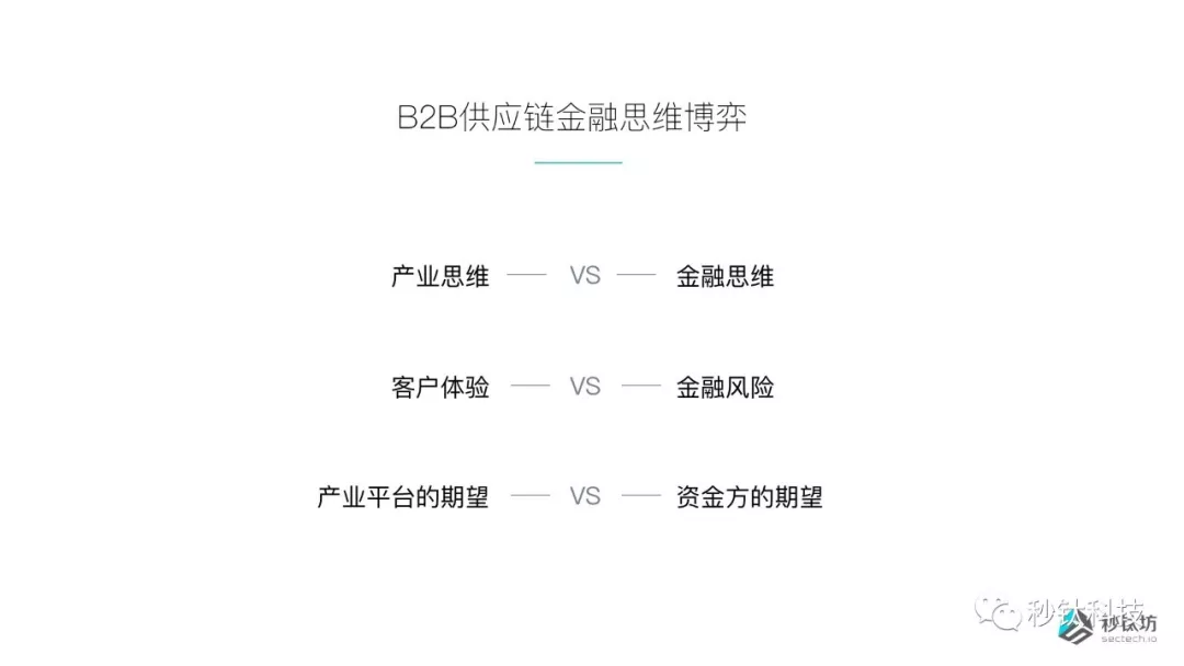 第一个是产业思维和金融思维的博弈。产业思维主要是以最好的产品、最小的成本、最快的速度、服务最多的客户。B2B行业的风险管理,主要是对生产、流通、销售、仓储、环节的管理。金融思维主要是在风险可控的范围内最大化金融收益。金融思维是接受风险,不断的平衡风险和收益的关系,两个思维对风险的认知和管理不同,导致业务的路径和金融的路径会完全不同。