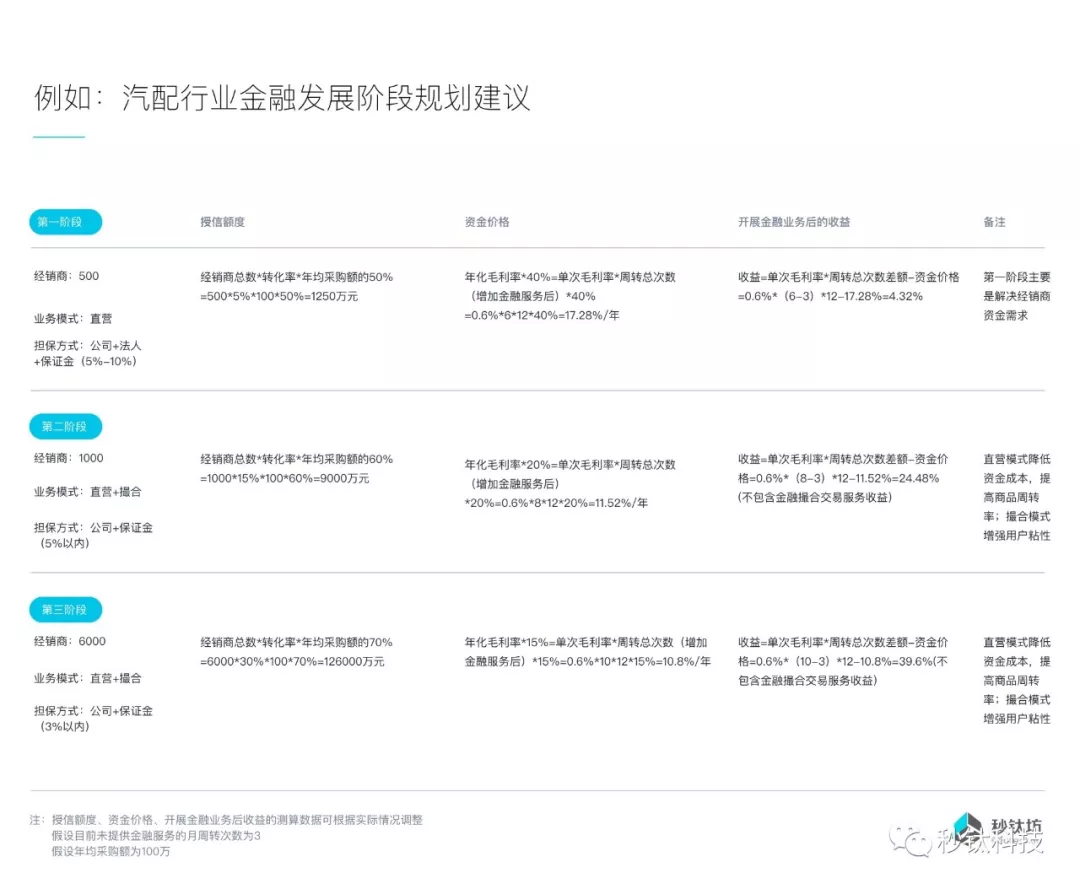 我们以汽配行业为例来规划金融发展阶段。根据经销商数量划分不同的阶段,选择不同的业务模式,例如直营、直营加撮合。