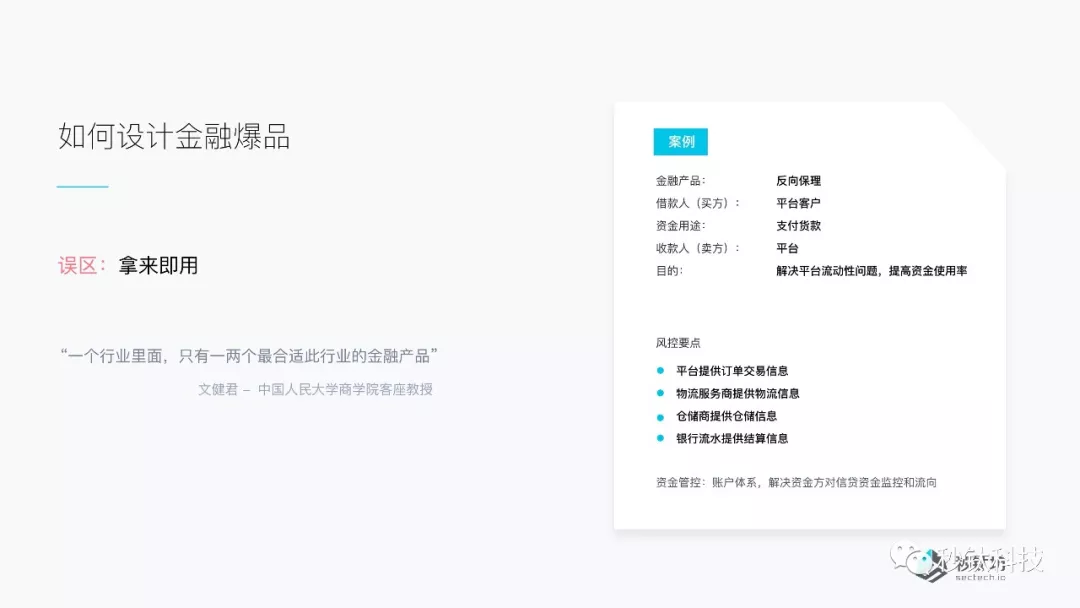 人民大学客座教授文健君说过。一个行业里面,只有一两个最适合此行业的金融产品。而在实际的业务中,大部分资金方同一个金融产品用在不同的行业,这是一种以信用驱动的,不是以供应链关系驱动的模式。其实在每个行业的金融产品的侧重点都会不同,要具体的行业具体设计。