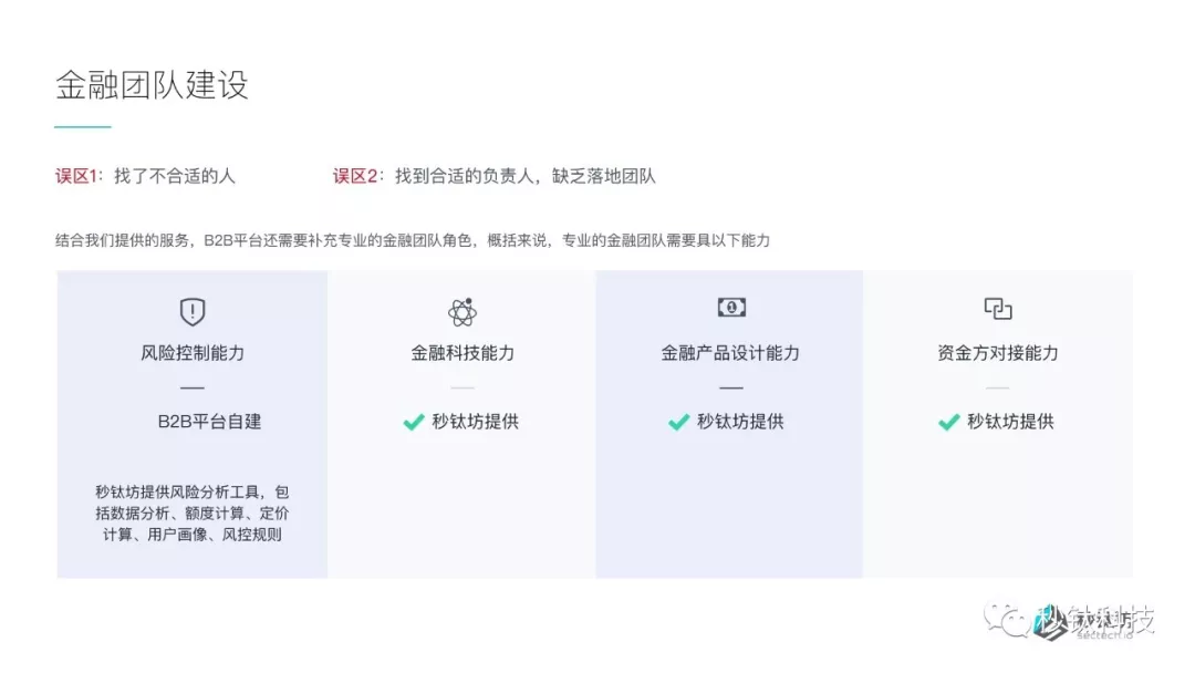 在金融团队搭建的过程当中,我们遇到的客户他们也经历了这些误区,第一个误区,是他找了不合适的人。因为目前开展B2B供应链金融需要的金融人才和风控人才跟传统的金融人才会有一些能力上不匹配。第二个是即使找到了合适的负责人,但是缺乏一个落地的团队。因为供应链金融需要综合风险控制的能力、金融科技的能力、金融产品设计能力以及资金方对接能力。其中金融科技能力,金融产品设计能力和资金方对接能力秒钛坊可以输出给到B2B平台。